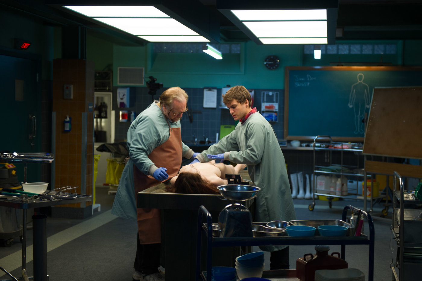 Ma l’eccellenza di Autopsy emerge in secondo luogo anche dall’altissimo livello registico, ancor più che nel suo già notevole Trollhunter; qui lo stile di Øvredal si fa più solido e personale, ricorrendo spesso al montaggio incrociato e spostandosi repentinamente dal volto dei due protagonisti a quello di Jane Doe (interpretata dalla quasi esordiente Olwen Kelly), così immobile eppure così espressiva, stando addosso ai corpi che si spostano lungo il tetro corridoio che affianca la sala autopsie, scegliendo di utilizzare in modo fuorviante specchi e altre superfici riflettenti, trasformando i volti, creando un’immagine distorta e generando con grande abilità un’inquietudine da cui non ci si scrolla fino all’ultima scena.
