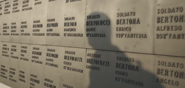 Sebbene Eugenio Barzaghi, non il fante qui ma il regista, dica quasi all’inizio di non essersi proposto di fare un cinema della “memoria”, questa sua spasmodica ricerca delle tracce di quel lontano parente annientato dalla guerra è destinata comunque a farsi testimonianza, più vivida di tante altre; giacché il voler ricostruire di sguincio questa identità dimenticata è affine a nostro avviso a quella ricerca di frammenti di vite soppresse con la violenza che cineasti come Rithy Panh, vedi L’immagine mancante (2013), hanno portato a vette eccelse. Al risultato contribuisce anche, spostandoci on the road con quest’agile produzione cinematografica, qualche spiazzante detour che dalle trincee della Prima Guerra Mondiale ci riporta all’oggi, alla quiete di quelle terre friulane che una festa di paese anima comunque di di presenze, di volti, di storie, di epifanie sorprendenti tra cui brilla quella della ragazzina impegnata in una esotica, spiazzante, per certi versi geniale “danza del serpente”. Stati di calma apparente? Probabilmente sì, considerando che la Storia è in continuo movimento e che proprio in queste ore da alcune delle località un tempo attraversate dal conflitto con gli austro-ungarici e oggi così stabili, sonnacchiose, giungono notizie allarmanti. Ovvero le vittime e i danni registrati in provincia di Gorizia, a Versa e dintorni, per colpa dell’alluvione. Anche in tempo di pace, la drammaticità dell’esistenza trova sempre il modo di palesarsi.