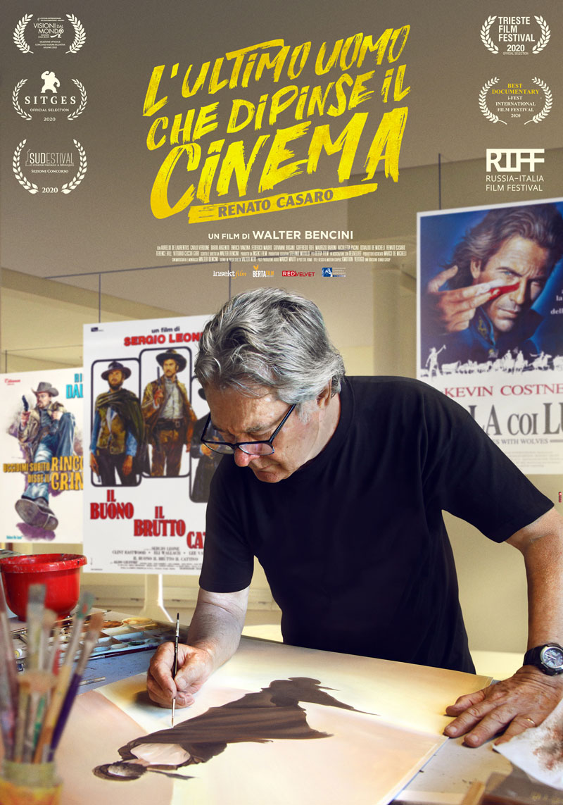 A ripercorrere la carriera di Renato Casaro, ci ha pensato Walter Bencini, con il suo documentario L’ultimo uomo che dipinse il cinema, presentato al Mescalito Biopic Fest 2020. Bencini va a trovare l’ormai ex-illustratore nella sua casa di Treviso, la sua città natale dove si è ritirato, con la moglie che è anche la sua musa, dopo aver vissuto in grandi città, Roma, Monaco di Baviera, dove lavorava per l’industria del cinema. Una casa di campagna, un mondo rilassato di provincia, di fianco a un imponente albero di ginkgo, che si tinge di giallo oro in autunno, con appesi nidi e mangiatoie per gli uccelli, e dove coltiva l’hobby dell’allevamento delle api. Una carriera, la sua, iniziata nel 1955 con le illustrazioni per il film Due occhi azzurri (Zwei blaue Augen) di Gustav Ucicky e conclusa nel 1999 con Asterix & Obelix contro Cesare. Tra i due estremi tutto un mondo di cinema, tanti capolavori che abbiamo amato, impossibile fare un elenco anche solo dei più importanti. Dalla cosiddetta Hollywood sul Tevere, dai kolossal di Dino De Laurentiis, italiani e americani, al cinema d’autore e a quello di genere, i western e i peplum italiani. Walter Bencini ne fa una carrellata con l’artista, soffermandosi su alcuni fondamentali o per i quali ci siano dei gustosi aneddoti da raccontare.